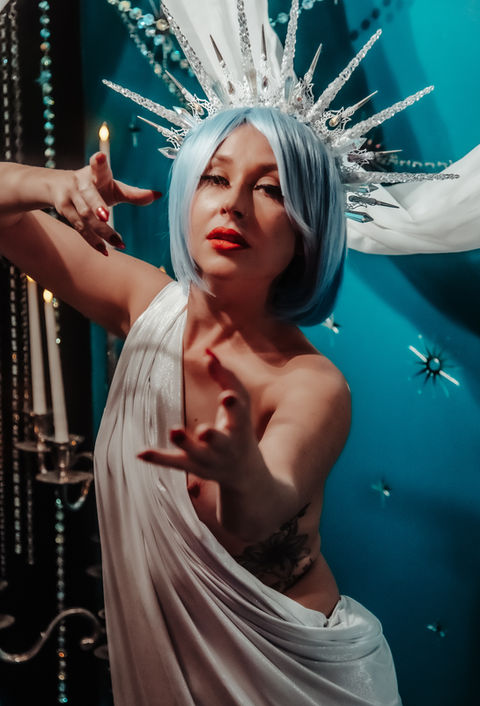 The Ethereal | Goddexx Bath features a stunning clawfoot tub surrounded by cascading crystals, sheer white and opalescent fabric, and the soft flicker of candlelight. Mirrored embellishments on the walls catch and scatter the light, wrapping your body in a warm, dreamlike glow. The tub can be moved out if you prefer to pose among the crystals and draped fabrics on their own, or swapped for a bench to create an open, ethereal composition that feels entirely your own.